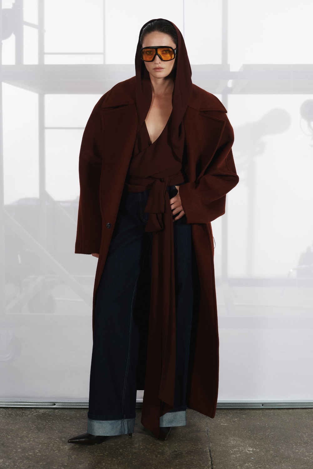 Бордово-коричневе пальто із заниженою талією