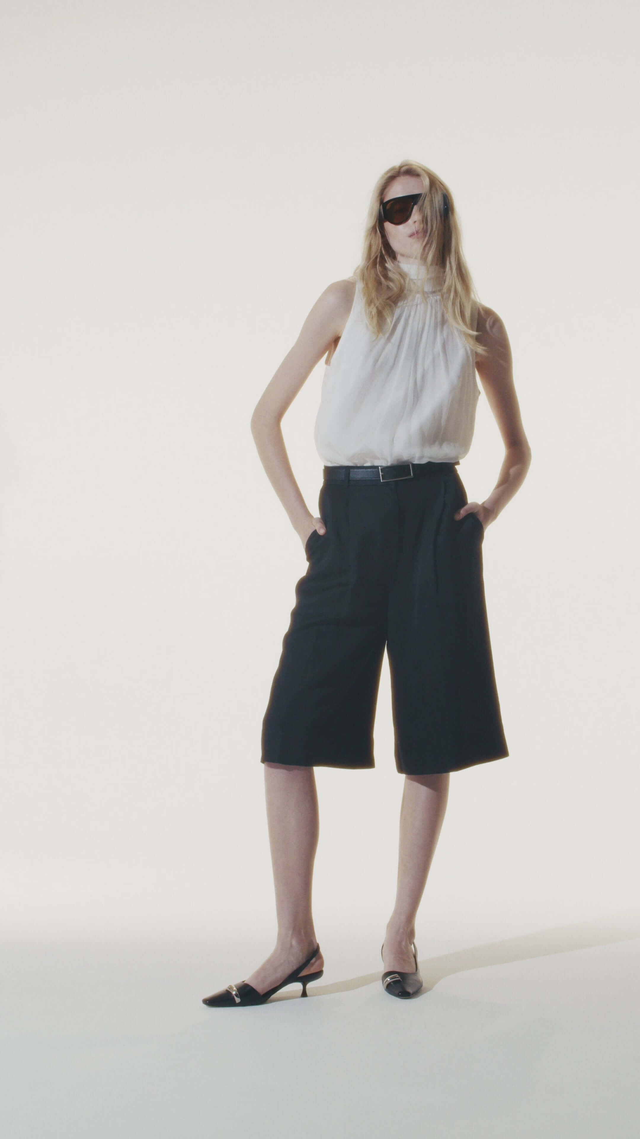 Black Bermuda shorts made from a thick viscose and linen blend. High rise, belt loops, front pleats. Wide legs and knee-length for comfort and freedom of movement.