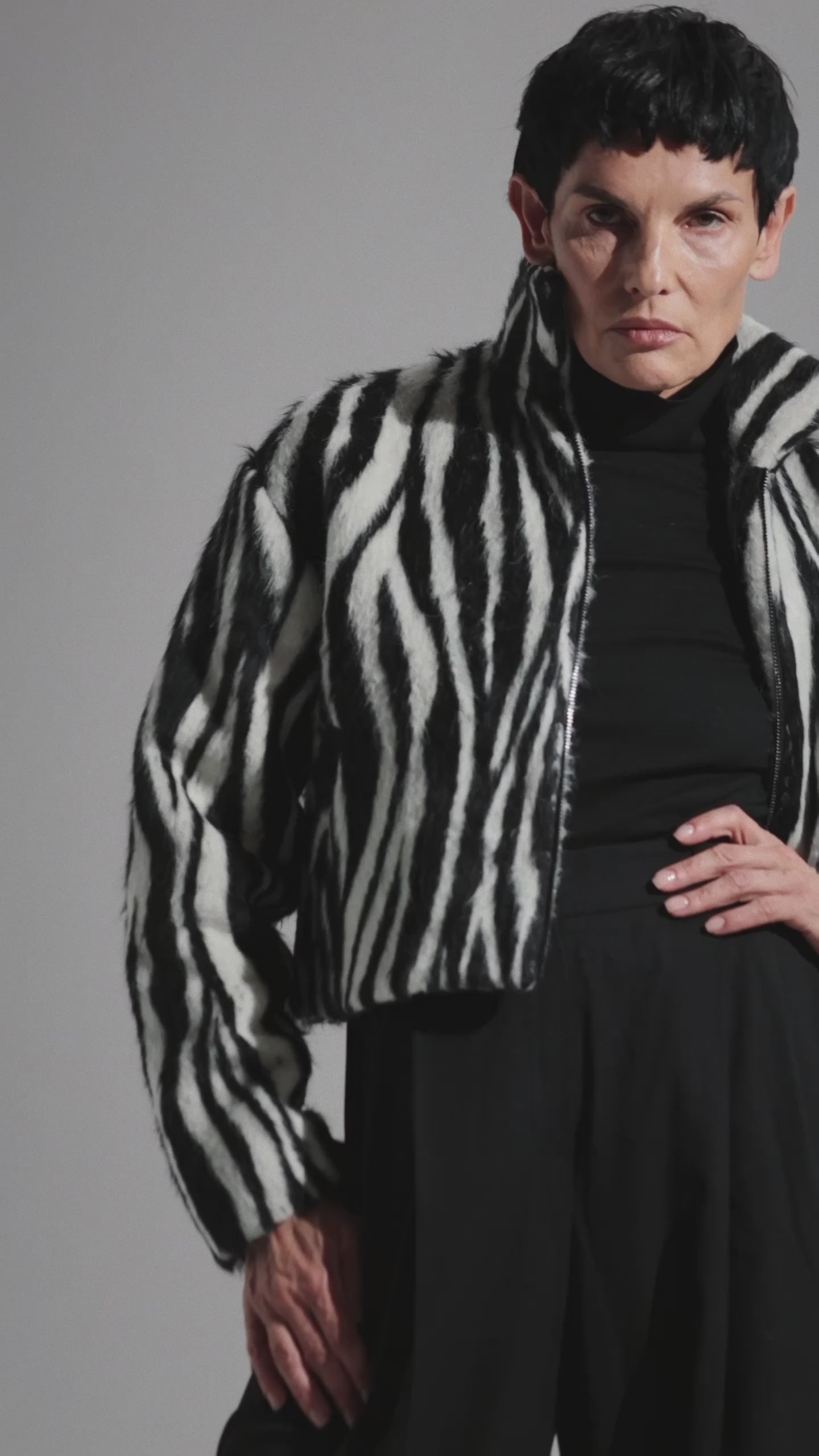 A jacket made of soft, textured fabric with a zebra print is an accent piece that instantly makes an outfit stand out. It has a comfortable fit, a zipper instead of buttons, and a shortened length. It looks bold, but easy to combine: wear it with classic black trousers, jeans, or even over a dress.