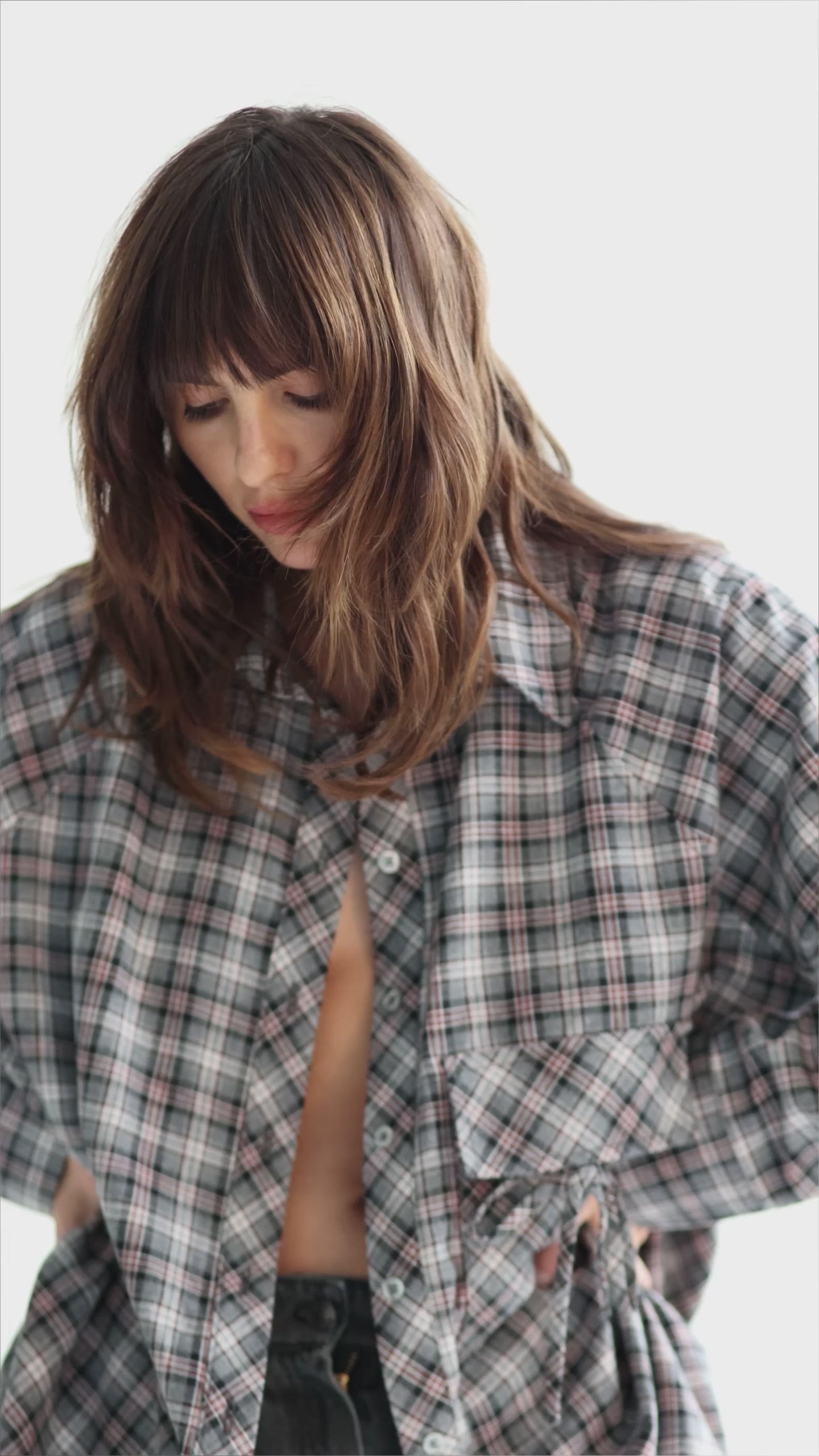Gray shirt in a red and white check pattern with an accent patch pocket with a bow. Loose fit, classic collar, button fastening. Basic, but with character.
