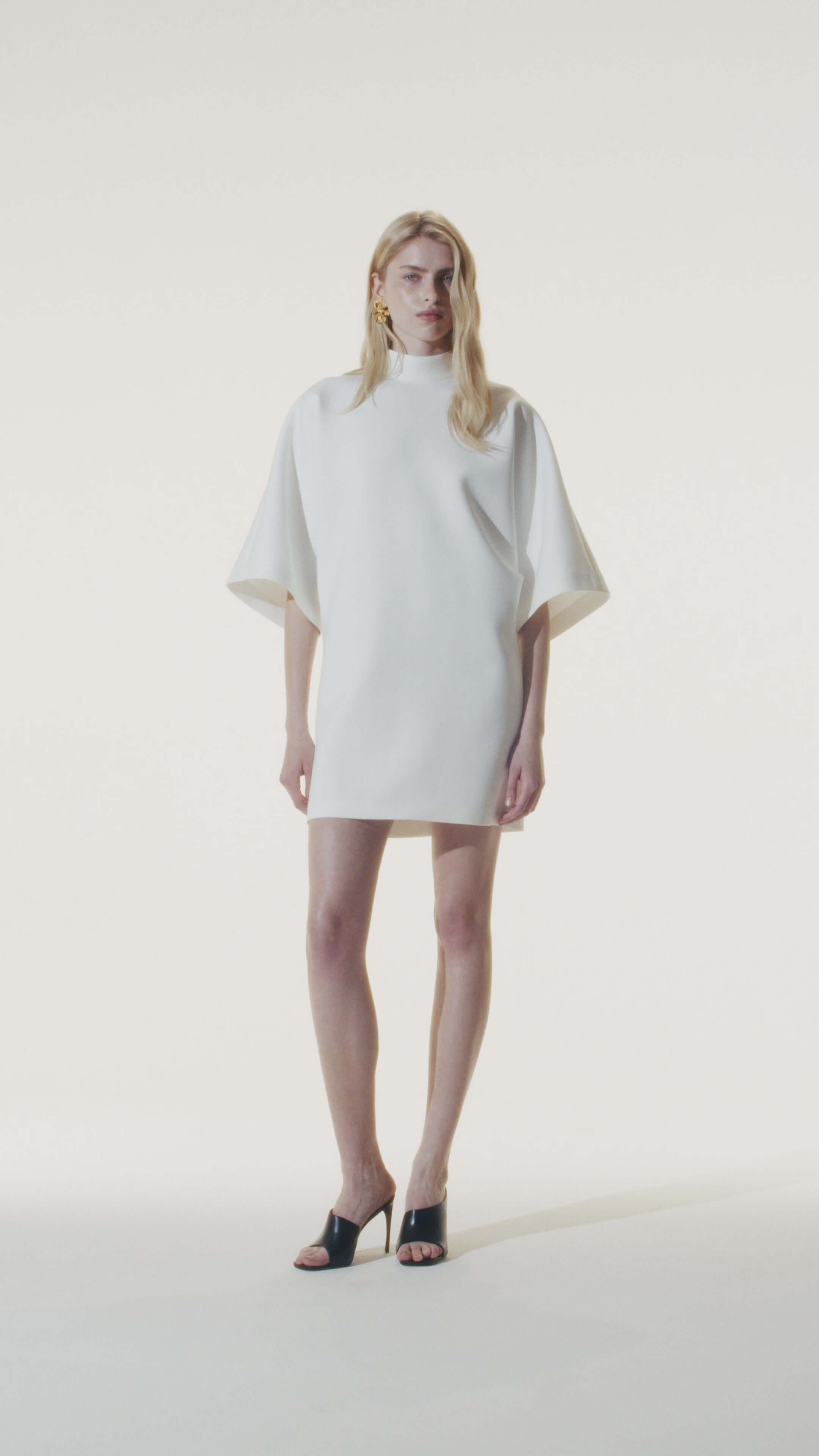 This dress is like a white silence that speaks louder than words. The scuba creates an architectural form: it holds volume, does not wrinkle, and remains light on the body. Wide sleeves, a high neckline, and a clear silhouette are like armor made of elegance.